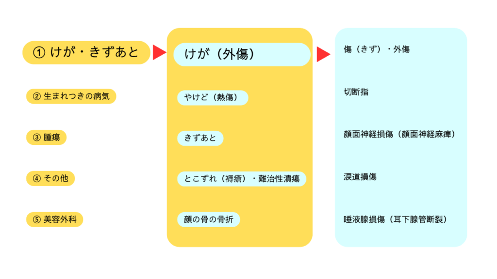 ①けが・きずあと、②生まれつきの病気、③腫瘍、④その他、⑤美容外科というくくりです。